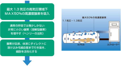![]() 脂肪は水と酸素によって燃焼されます。日常生活によって水は手軽に摂取できますが、酸素を取ることは困難なものです。高気圧酸素をカプセルで取る事により効率的な脂肪燃焼が期待できます。 |